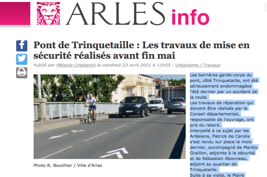 ''Les barrières garde-corps du pont, côté Trinquetaille, ont été sérieusement endommagées l’été dernier par un accident de la route.Les travaux de réparation qui doivent être réalisés par le Conseil départemental, responsable de l’ouvrage, ont pris du retard.Interpellé à ce sujet par les Arlésiens, Patrick de Carolis s’est rendu sur place le mois dernier, accompagné de Mandy Graillon, adjointe à la sécurité et de Sébastien Abonneau, adjoint au quartier de Trinquetaille.Suite à sa visite, le Maire d’Arles a......