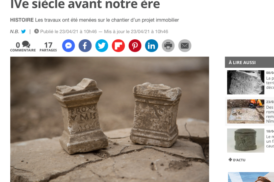 ''Les fouilles des archéologues de l’Institut national de recherches archéologiques préventives (Inrap), ont permis de retrouver, sur le chantier d’un projet immobilier, àNîmes (Gard), des vestiges datant du IVe siècle avant notre ère. Ces divers objets proviennent d’un quartier urbain, qui aurait perduré jusqu’au IIe siècle de notre ère.