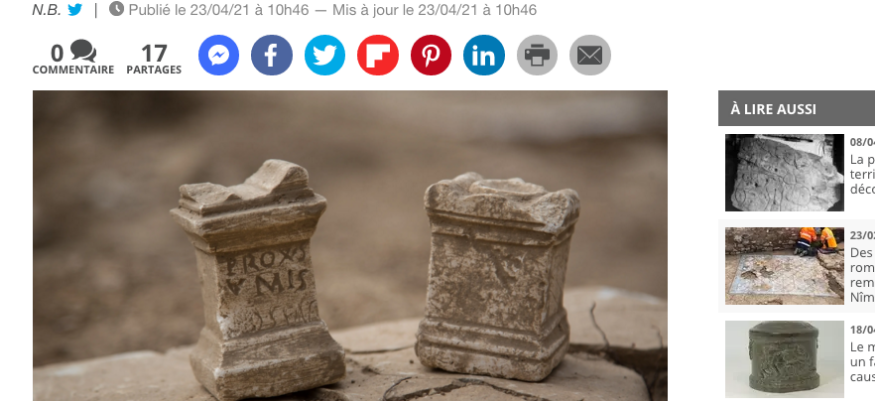Parmi ces trouvailles, les restes du foyer d’une cuisine, une amphore qui aurait été utilisée pour une plantation dans un jardin, un pendentif en os ou deux splendides petits autels, issus d’une « domus », les maisons traditionnelles romaines. (...)''
