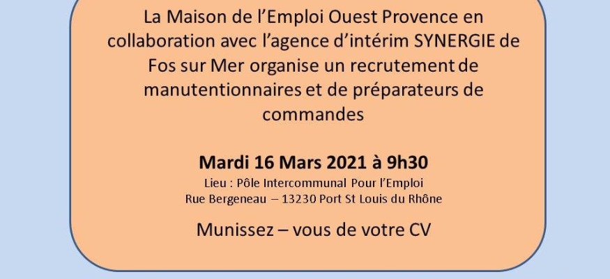 Une nouvelle campagne de recrutement en logistique est prévue ce mardi 16 mars à 9h30 au Pôle Intercommunal pour l'Emploi. Contactez la Maison de l'Emploi au 04 42 48 03 90